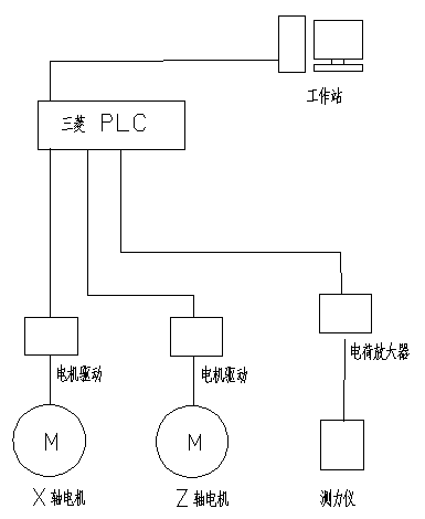 軟件系統(tǒng)由工作站、微型可編程控制器、電機驅(qū)動器、X軸電機、Z軸電機、實驗室多通道電荷放大器、測力儀和專用軟件組成。